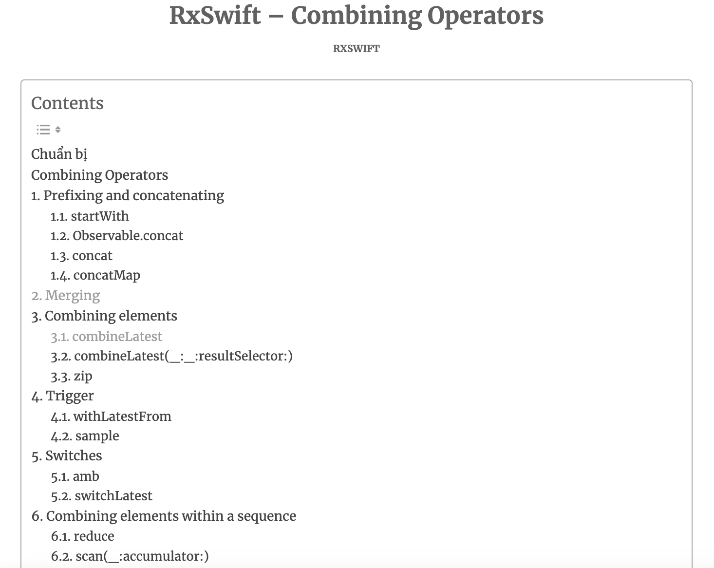 flatMapLastest: cũng hợp nhất nhiều Obsevable thành Obsevable nhưng chỉ lắng nghe giá trị phát đi của Obsevable cuối cùng.Thực tế áp dụng kiểu Obsevable phát đi sự kiện, trong hàm của Obsevable tầng 1, mình tạo ra 1 cái Obsevable mới (tầng 2). thì phải dùng flatMapLastest để chỉ lắng nghe Obsevable tầng 2. Ví dụ:****
