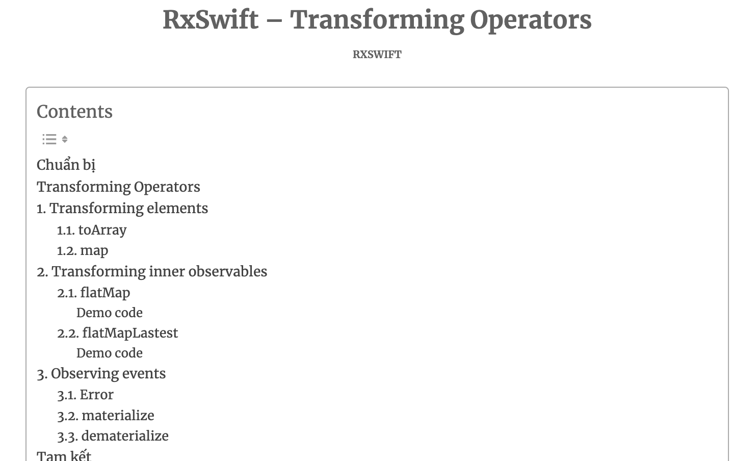 **Side Effect: những hành động xảy ra ngoài quy trình của Observable. Một số toán tử thường dùng: do(onNext:), .subscribe(onNext:)