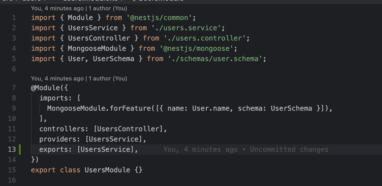 khai báo model User này được sử dụng trong module UsersModule,