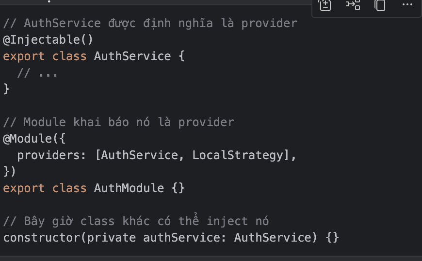 ={yellow}@Injectable=: được hiểu là 1 decoderator khiến nest.js hiểu rằng class này sẽ được quản lý IOC container giúp cho ở 1 class ko cần khởi tạo class đươc khai bao với từ khoá này